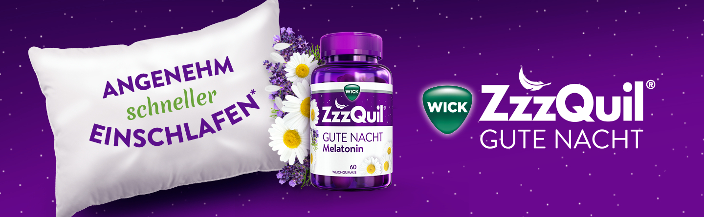 Das Leben ist besser, wenn man besser einschläft. Manchmal halten uns jedoch Sorgen des Tages abends vom Einschlafen ab. Wie es der Zufall will, scheinen die schlaflosen Nächte immer dann zu kommen, wenn man seine ganze Energie braucht, um den kommenden Tag zu bewältigen. Für solche Zeiten haben wir WICK ZzzQuil® Gute Nacht entwickelt, ein Nahrungsergänzungsmittel mit Melatonin, das Ihnen hilft, schneller einzuschlafen* und durch Vitamin B6 am nächsten Tag erholt aufzuwachen**, ohne Müdigkeit am nächsten Tag. Melatonin ist ein körpereigenes Hormon, das keinen Gewöhnungseffekt verursacht. Nehmen Sie es einfach bei Bedarf ein und beenden Sie die Einnahme, wenn Ihr Schlaf-Wach-Rhythmus wieder reguliert ist.